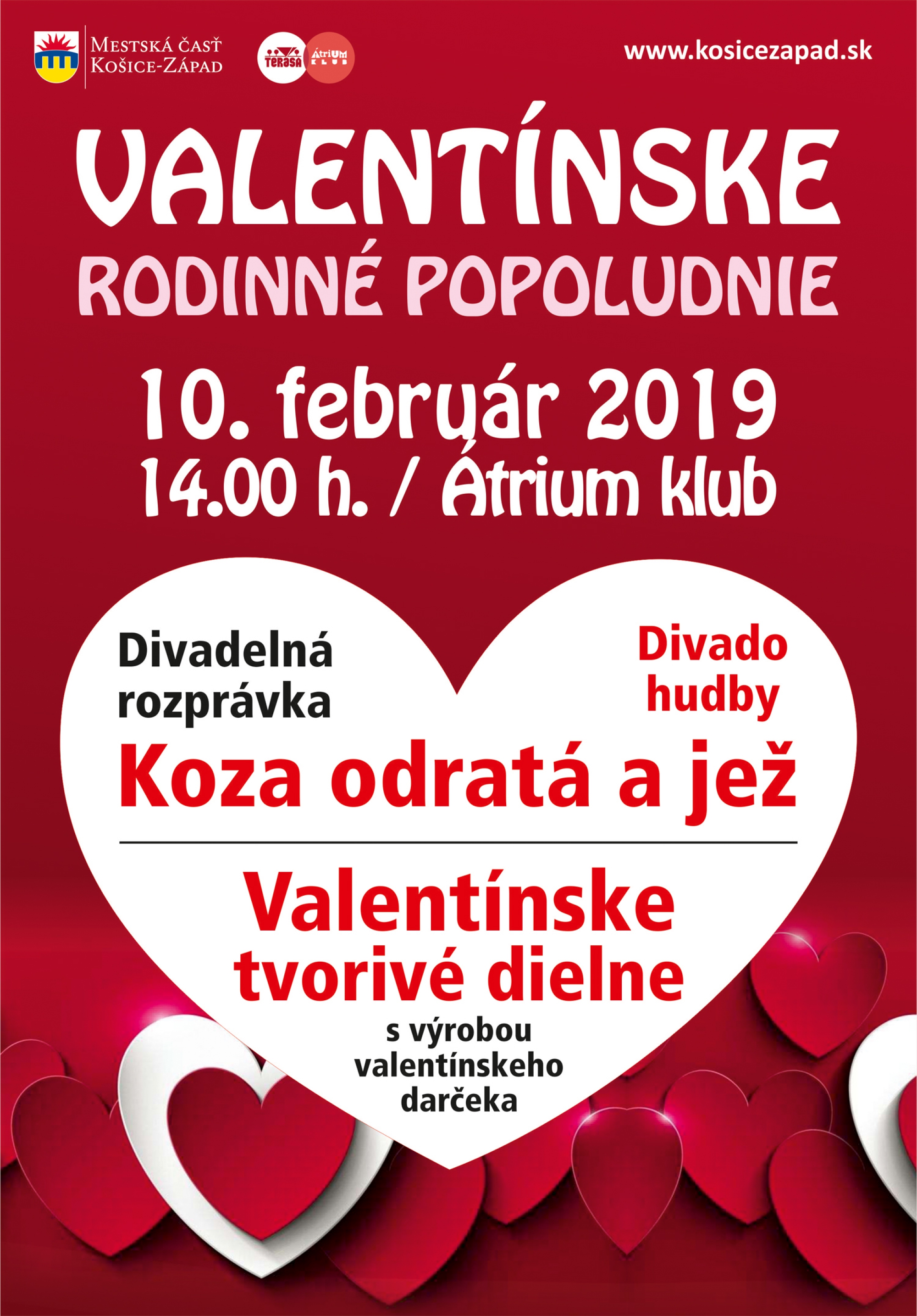blíži sa sviatok Sv. Valentína, preto sme sa rozhodli pripraviť pre vás Valentínske rodinné popoludnie, ktoré sa bude konať v nedeľu 10. februára 2019 od 14:00 hod. v Átrium klube, Zuzkin park 4. Hlavným programom popoludnia bude divadelné predstavenie ,,Koza odratá a jež,, v podaní členov Divadla hudby. Pozvaní sú malí aj veľkí, jednoducho všetci, ktorí majú chuť a odhodlanie vlastnoručne pripraviť valentínsky darček pre svojho blízkeho. Pomáhať vám pri tom budú žiaci SSOŠ Bukovecká pod vedením pedagogického dozoru.