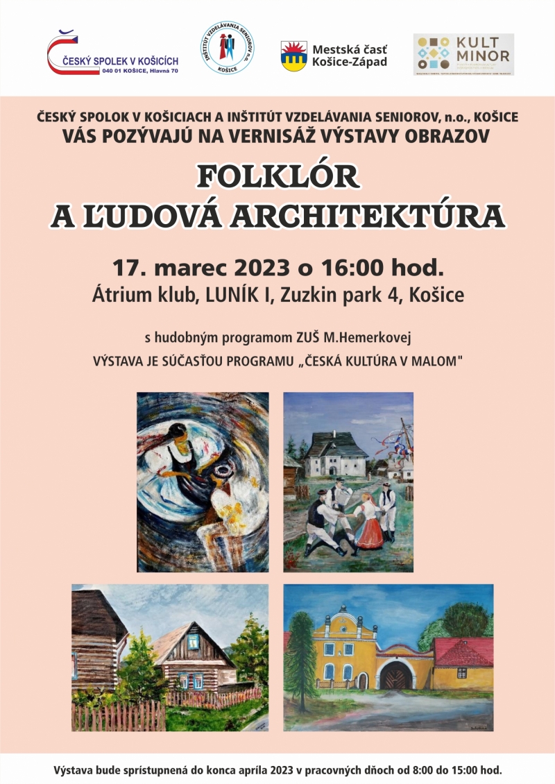 pozývame vás na vernisáž výstavy obrazov Českého spolku v Košiciach s názvom FOLKLÓR A ĽUDOVÁ ARCHITEKTÚRA. Vernisáž sa uskutoční dňa 17. marca 2023 (piatok) o 16.00 v priestoroch Átrium klubu Zuzkin park 4. Výstava obrazov s folklórnou tematikou poteší určite nie len skôr narodených, ale bude prínosom i pre mladšiu generáciu milovníkov umenia. Výstava obsiahne diela cca 20 výtvarníkov a o kultúrny program sa postarajú žiaci ZUŠ Márie Hemerkovej v Košiciach pod vedením p. Malinovej.