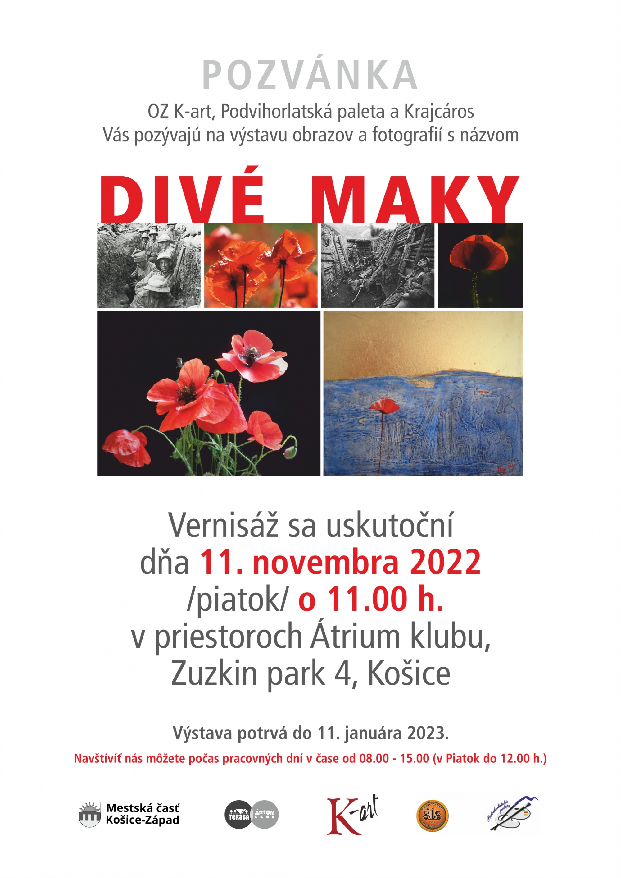 Piatok 11. novembra 2022 o 11.00 hod. v Átrium klube, Zuzkin park 4 bude opäť patriť milovníkom umenia. OZ K-art, Podvihorlatská paleta a Krajcáros Vás pozývajú na vernisáž výstavy obrazov a fotografií s názvom DIVÉ MAKY, venovanej pamiatke padlým hrdinom 1. svetovej vojny.